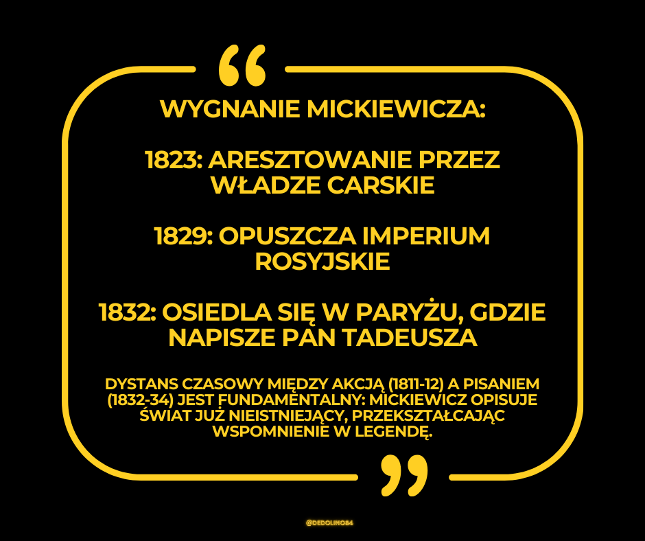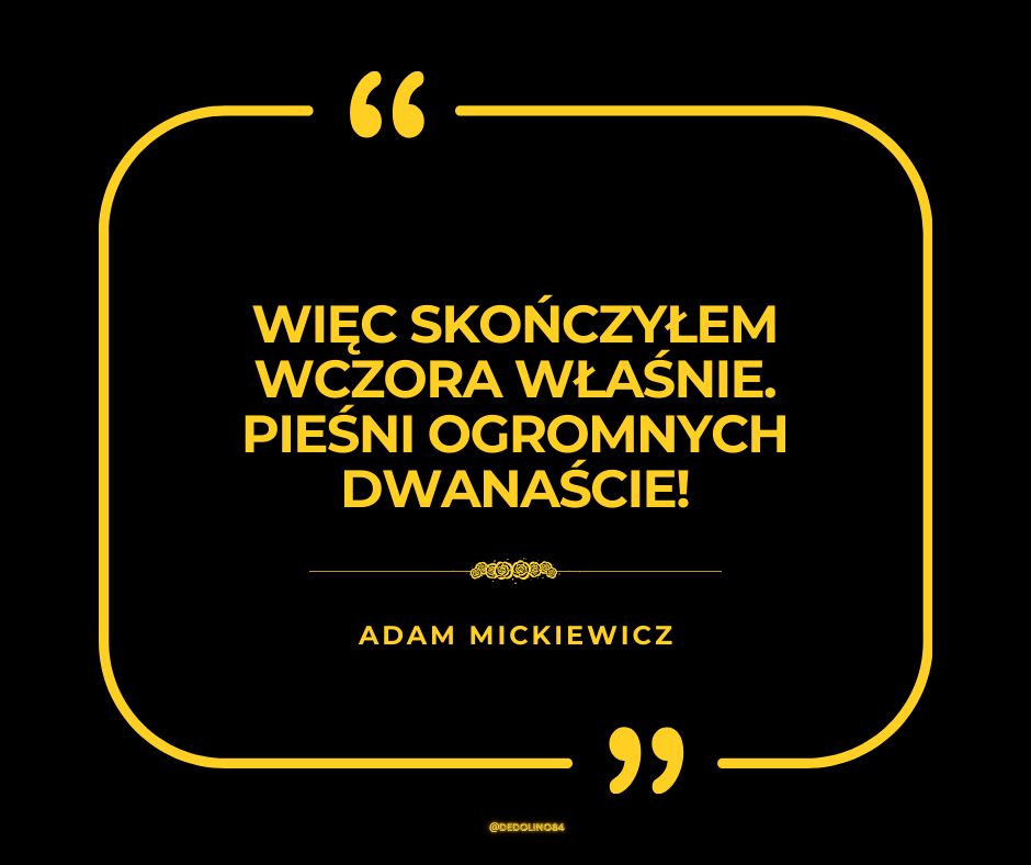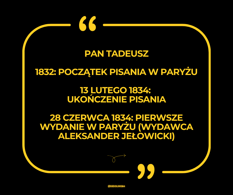 W nocy 13 lutego 1834 roku w Paryżu poeta polski na wygnaniu odłożył pióro po napisaniu ostatniego wersu swojego narodowego poematu epickiego. Następnego dnia, w liście do przyjaciela Antoniego Edwarda Odyńca, Mickiewicz napisał z radością: “Więc skończyłem wczora właśnie. Pieśni ogromnych dwanaście!”